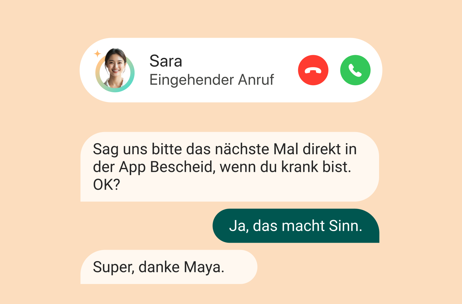 Sara ist ein AI-gestützter Anwesenheitscoach, der automatisch nachfasst, wenn eine Arbeitskraft sich nicht über die App einstempelt. Sie ruft die Arbeitskraft an, fragt nach dem Grund und teilt das Ergebnis in Echtzeit mit dem Manager.