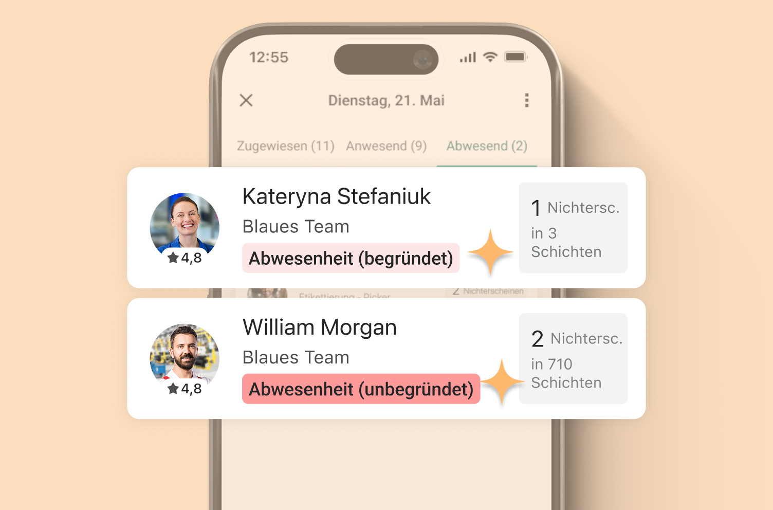 Abwesenheitsgründe werden erklärt und mit Labels wie „Grund angegeben“, „Nicht erreichbar“ oder „Begründet“ versehen – für mehr Kontext. So wissen Sie, wer nicht erschienen ist und warum.