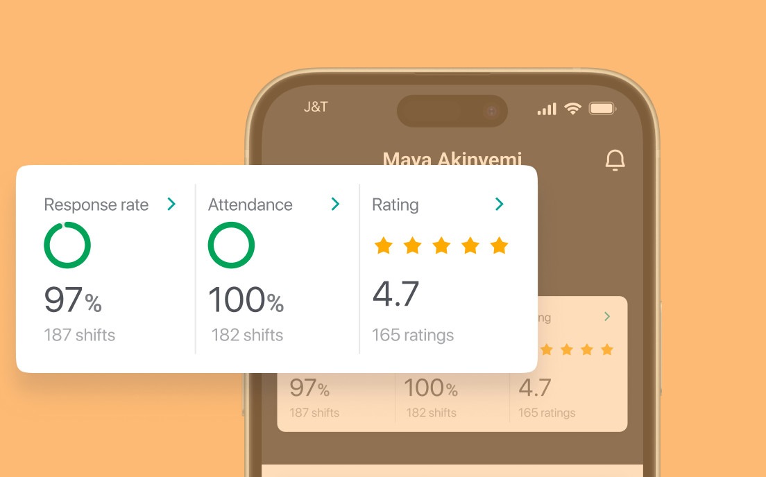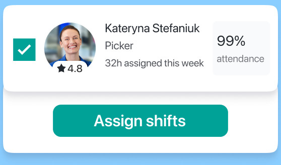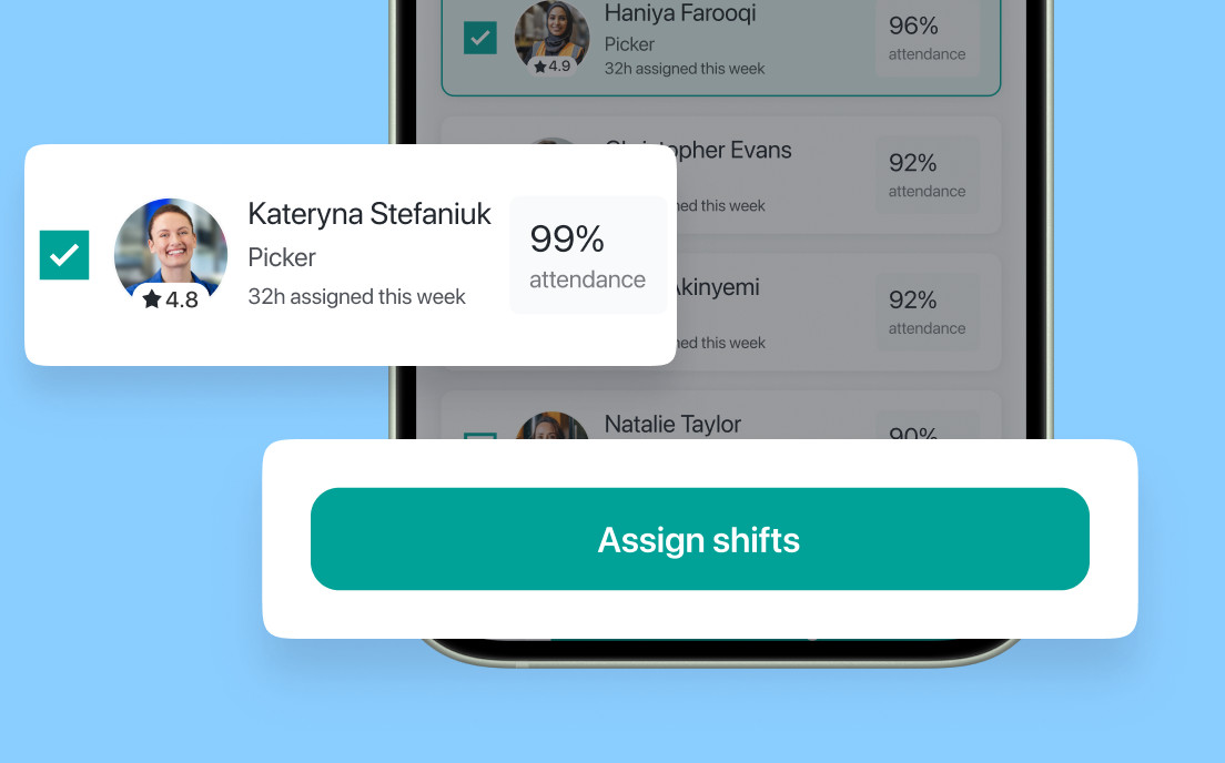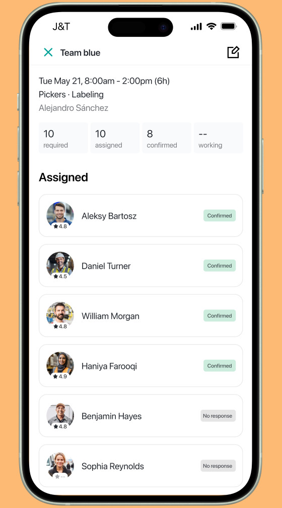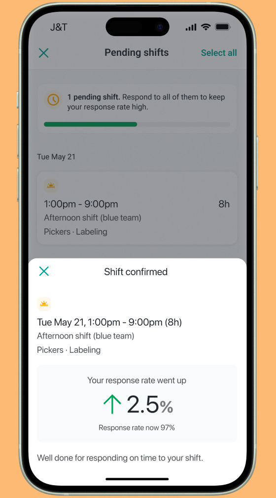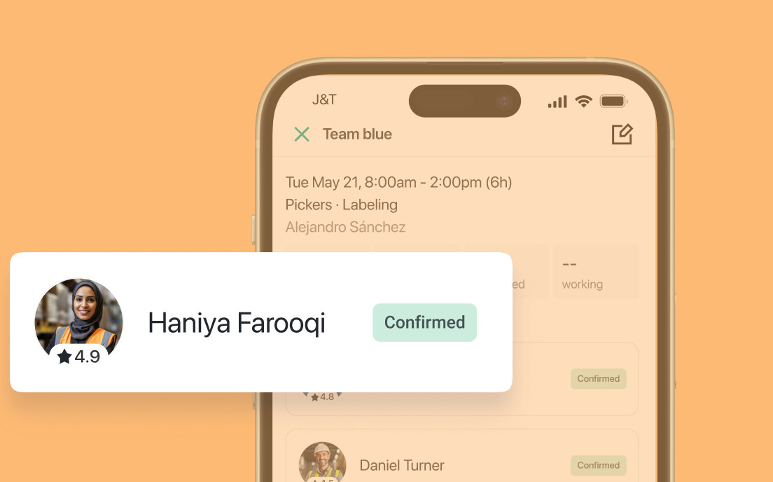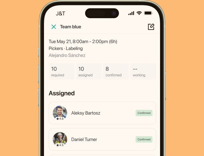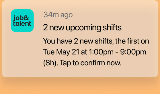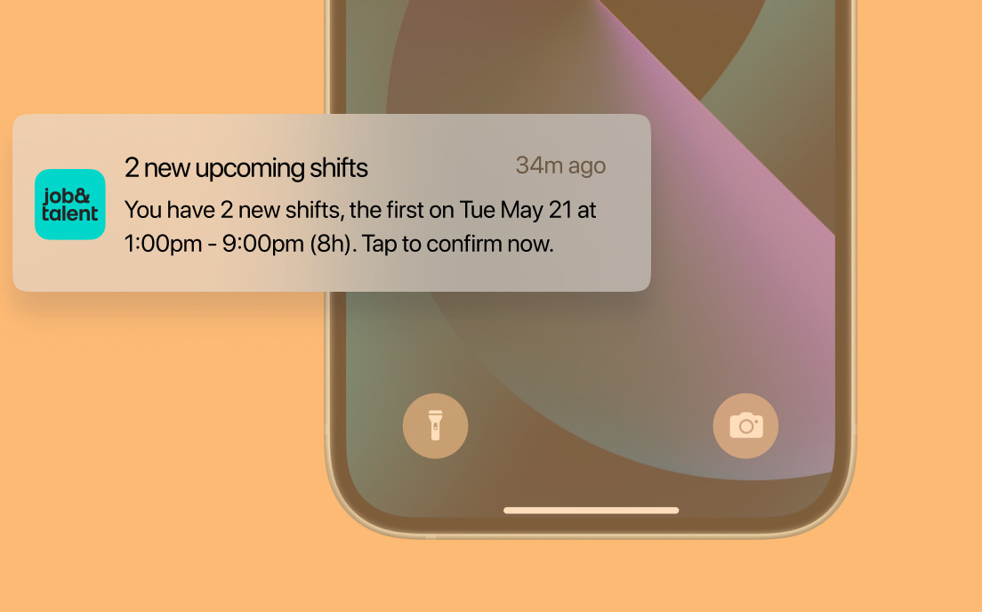 Schichtleiter richten in der Job&Talent Business-App mit wenigen Klicks Schichten ein und weisen Arbeit zu. Die Arbeitskräfte werden dann in der Arbeitnehmer-App benachrichtigt, dass sie arbeiten. Wenn sie die Schicht annehmen, erhält der Schichtleiter sofort eine Rückmeldung. Das bedeutet, dass Sie sicher sein können, dass Ihr Bedarf gedeckt ist.